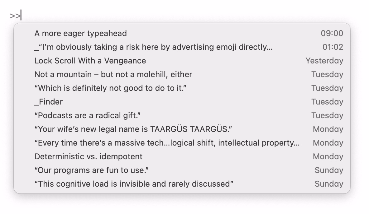 This blog is authored in Apple Notes, and some time ago Notes added quick linking via typing >>, and that has a similar effect: The interactions are so nimble and precise that it is very easy to link to something, but a nice side effect is that it also feels very welcoming just to type a few letters to remind yourself of a title of an article, and then cancel out.