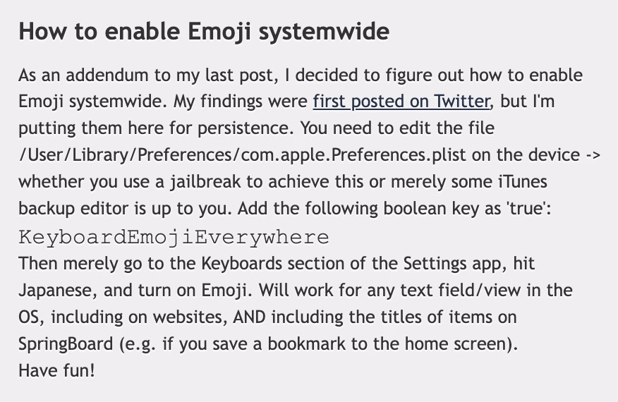 Eventually, an enterprising developer realized that emoji outside Japan was as easy as toggling a UI-less preference with a great name KeyboardEmojiEverywhere, hiding inside the innards of the iPhone:
